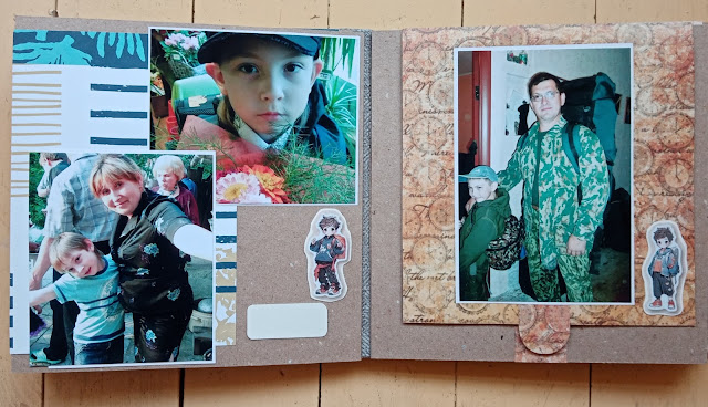 Подруга разрешила мне вам показать его с фотографиями, по-этому я смело вам показываю. Всего в альбоме 11 разворотов, каждый разворот вмещает от семи до 11 фотографий. А на обложке две фотографии, как будто взрослый парень смотрит на себя в детстве :)