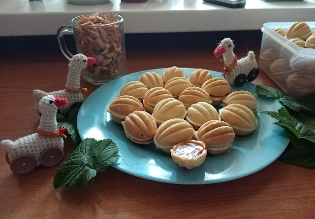 А приехав домой, я испекла орешки со сгущенкой и гусики полезли в тарелку с орешками.